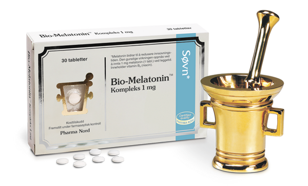 Melatonin kan bidra til å redusere innsovningstiden og til å lindre den subjektive opplevelsen av jetlag, 1 tablett inntas rett før leggetid. Bio-Melatonin Kompleks er et kosttilskudd som inneholder 1 mg melatonin og 10 mg niacin (vitamin B3), som er en forløper til melatonin.For å produsere niacin trenger kroppen tryptofan, som kroppen også bruker til å syntetisere melatonin. Ved å tilsette 10 mg niacin til produktet spares 600 mg tryptofan.Melatonin bidrar til å redusere innsovningstiden når 1 mg melatonin (1 tablett) inntas ved leggetid. Virkningen av Bio-Melatonin Kompleks kan bli optimalisert ved å ta det på samme tid hver dag. HelsepåstanderDen europeiske myndighet for næringsmiddeltrygghet (EFSA) har vurdert dokumentasjonen bak produktets innhold av niacin og melatonin og godkjent følgende påstander:Melatonin:bidrar til å lindre den subjektive opplevelsen av jetlag*bidrar til å redusere innsovningstiden***For at påstanden skal kunne brukes, må forbrukerne opplyses om at den gunstige virkningen oppnås ved å innta minst 0,5 mg melatonin ved leggetid den første reisedagen og deretter noen dager etter ankomst til reisemålet. ** For at påstanden skal kunne brukes, skal forbrukerne opplyses om at den gunstige virkningen oppnås ved å innta 1 mg melatonin ved leggetid. Niacin:bidrar til normal energiomsetningbidrar til nervesystemets normale funksjonbidrar til normal psykologisk funksjonbidrar til å opprettholde normale slimhinner og normal hudbidrar til å redusere tretthet og utmattelse Innhold:Fyllstoff (mikrokrystallinsk cellulose), vitamin B3 (nikotinsyre), konsistensmiddel (silisiumdioksid), stabilisator (kryssbundet natriumkarboksymetylcellulose), antiklumpemiddel (maltodekstrin), melatonin, overflatebehandlingsmiddel (hydroksypropylmetylcellulose), antiklumpemiddel (magnesiumsalter av fettsyrer). Innhold per døgndose (1 tablett):Niacin (vitamin B3) 10 mgMelatonin 1 mg Bruksveiledning:Anbefalt døgndose er 1 tablett daglig ved leggetid.Bør ikke brukes av barn og unge under 18 år. Hva er egentlig melatonin?Melatonin er et naturlig signalstoff som finnes i en lang rekke levende organismer. I de fleste dyr, inkludert mennesket, er melatonin en nøkkelsubstans når det gjelder sesong- og døgnrytme. Hos mennesket skilles melatonin ut fra epifysen og kontrolleres av et område i hypotalamus.Syntese og utskilling av melatonin stimuleres av mørke og hemmes av lys. Syntesen av melatonin er høyest mellom klokka 02.00 og 04.00. Hvis du står opp om natta og skrur på lyset, vil kroppens melatoninproduksjon opphøre. Maksimal produksjon av melatonin vil først være på topp igjen etter noen timer med mørke.Det er ikke alle frekvenser i lysspekteret som hemmer melatoninproduksjonen. Det er kun lys i den blå enden av det synlige lysspekteret som hemmer produksjonen av melatonin, men denne typen lys er ofte i kunstige lyskilder.Kroppen har høyest melatoninproduksjon i 3-5 årsalderen og fram til voksenlivet. Deretter faller produksjonen gradvis resten av livet....