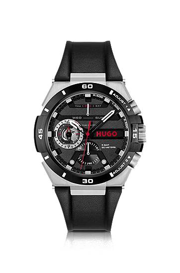 A boldly designed watch by HUGO, engineered with brushed indexes, a grained dial with a matte top piece and a black leather strap.