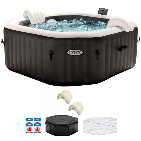 Pays de fabrication Chine, Largeur piscine 218cm, Hauteur piscine 71cm, Capacité piscine 1098L, Nb maximal de personnes 5-6, Nb de Jets 140jets, Forme Octogonale, Hauteur max de l'eau 60cm, Longueur piscine 218cm, Couleur piscine Noire, Filtre À cartouche, Débit horaire max 1741L/h, Bâche de protection Incluse, Tapis de sol Inclus, Chlorinateur Inclus, Module WIFI (en dotation), Appuie-Têtes (en dotation) Gonflable, Traitement eau calcaire en dotation, Gestion à travers l'App