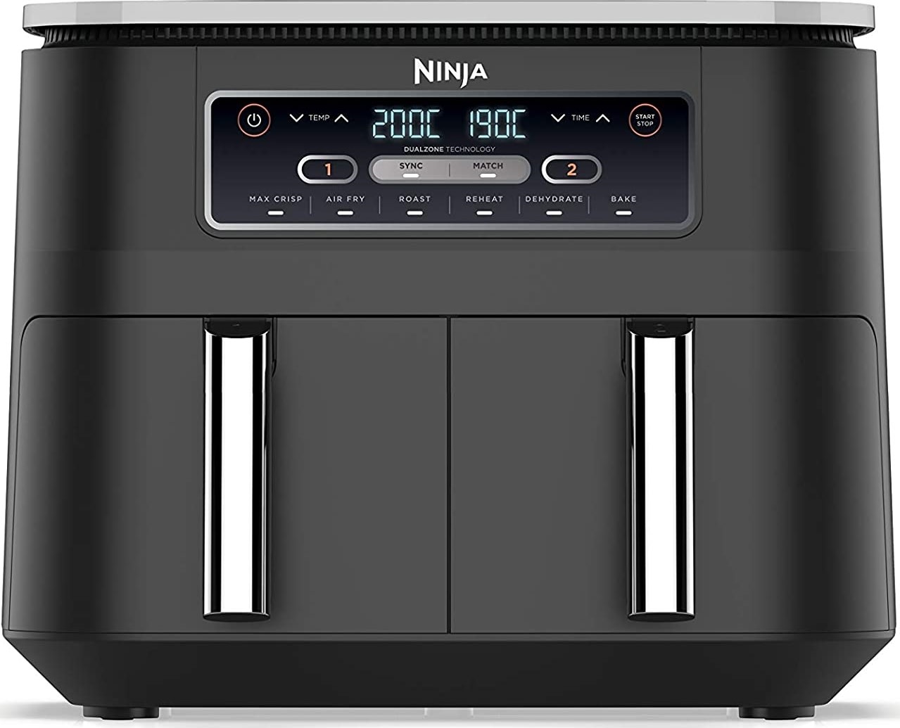 Ninja Air Fryer Dual Zone, 7,6 L Fra perfekt kogte fries og sprøde kyllingevinger til ristede grøntsager, giver Ninja Air Fryer Dual Zone dig den samme gode smag ved hjælp af lidt eller ingen olie. Det er mere end en frituregryde. Med 6 tilberedningsfunktioner Air Fry, Roast, Max Crisp, Bake, Reheat og Dehydrate kan du ikke kun lave lækre hovedretter og tilbehør, du kan også genopvarme for at genoprette rester og få den frisk-ude-af-ovnens tekstur. Du kan endda forsigtigt dehydrere ingredienser for at nyde hjemmelavede tørrede frugter, grøntsagschips og oksekød. Når det kommer til madlavning, er timing alt. Ninja Dual Zone 7.6L Air Fryer sikrer timingen for dig. Tilbered 2 forskellige måltider med forskellige temperaturer, tidspunkter og indstillinger i 2 separate madlavningsskuffer - og begge er klar til at servere på nøjagtig samme tid ved hjælp af SYNC -funktionen. MATCH indstillinger på tværs af begge zoner for at lave dobbelt mængden af mad på samme tid! Kog fra frossen til lækkert sprøde resultater, uden at det er nødvendigt at optø mad først. Aftensmaden kan være på bordet på få minutter takket være Air Fryers hurtige programmer, der kan tilpasses, one-touch-knapper og hurtig luftstrøm. Præcisionstemperaturkontrol er konstrueret til nøjagtighed og sikrer, at din mad er tilberedt til perfektion. Vælg mellem variable varmeindstillinger og to blæserhastigheder. Specifikationer: Produkttype: Air fryer Farve: Sort Kapcitet: 7,6 L Effekt: 1200 W / 2400 W Størrelse: 31,5 x 38 x 26,5 cm Vægt: 8,2 kg