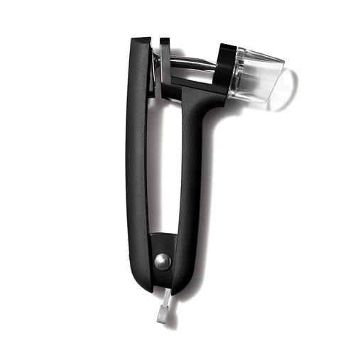 The Cherry & Olive Pitter's removable splatter shield keeps juices contained and directed downward. Large holder accommodates Bing cherries, and a recessed cup holds smaller varieties of cherries and olives. Comfortable, non-slip handle absorbs pressure while you squeeze.