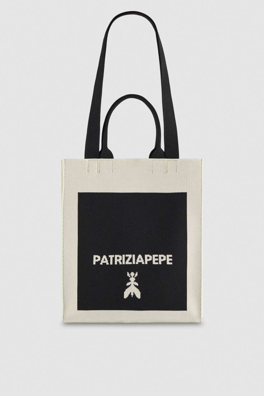 Pionowa torebka shopperka charakteryzuje się kolorowym wzorem z żakardowym logo „PATRIZIAPEPE FLY”. Wyposażona w podwójne uchwyty i praktyczną kieszeń wewnętrzną, łączy w sobie praktyczność i nowoczesny styl.