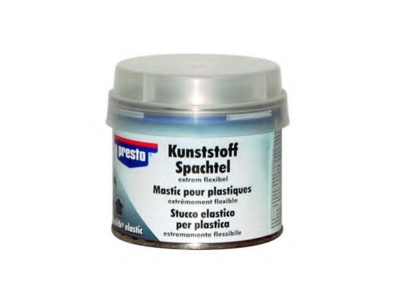 PRESTO elastic Kunststoffspachtel (250 g) presto elastic Kunststoffspachtel ist ein zweikomponentiger, schwarzer Polyesterspachtel, als Mischung eines hochelastischen, aminvorbeschleunigten Polyesterharzes mit verschiedenen mineralischen, umweltfreundlichen Füllstoffen. Zum Füllen von Kratzern und Beschädigungen und zur Nachbehandlung geklebter Kunststoffteile. Durch seine Thixotropie und Geschmeidigkeit lassen sich Konturen und Profile mühelos wieder herstellen. Neben der sehr guten Haftung auf fast allen Kunststoffen kann der Spachtel auch auf Karosserieblechen und verzinkten Blechen aufgetragen werden. Eigenschaften: Inhalt: 250gHöhe [mm]:78 mm Gewicht [kg]:0,307 kg Arbeitstemperatur von [°C]:12 °C Tiefe [mm]:78 mm Gewicht [g]:250 g Gebindeart:Dose Arbeitstemperatur bis [°C]:30 °C Breite [mm]:78 mm