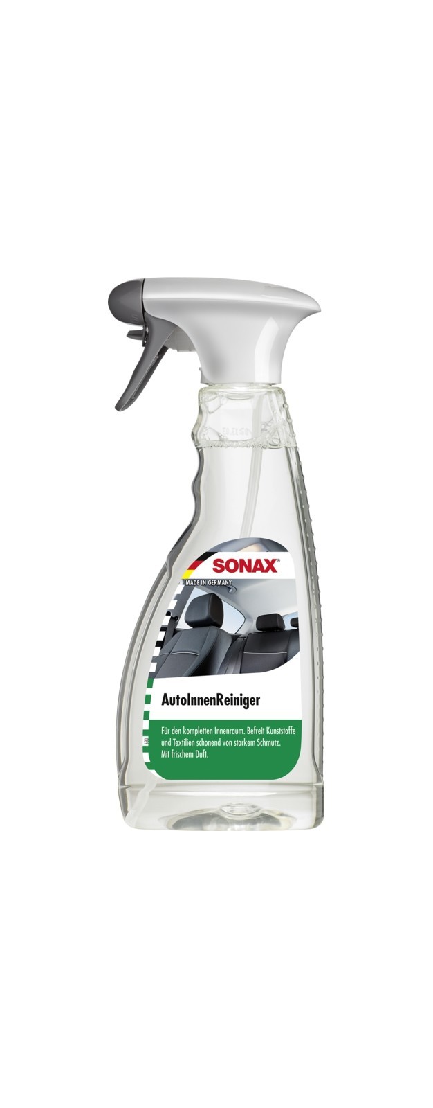 SONAX AutoInnenreiniger (500 ml) Gebindeart: Flasche Gewicht: 0,592 kg Höhe: 23,7: cm Breite: 5,7: cm Inhalt: 500: ml Tiefe: 9,7: cm Für den gesamten Autoinnenraum. Entfernt gründlich und schonend selbst hartnäckigen Schmutz an Innenverkleidungen, Cockpit, Polstersitzen und Fahrzeughimmel. Bringt frischen Duft ins Auto. Produkteigenschaften Spezialreiniger für den kompletten Fahrzeuginnenraum Für Kunststoff- und Textil-Oberflächen wie Innenverkleidungen, Cockpit, Polstersitze und Fahrzeughimmel Entfernt gründlich und schonend selbst hartnäckigen Schmutz Bringt frischen Duft ins Auto
