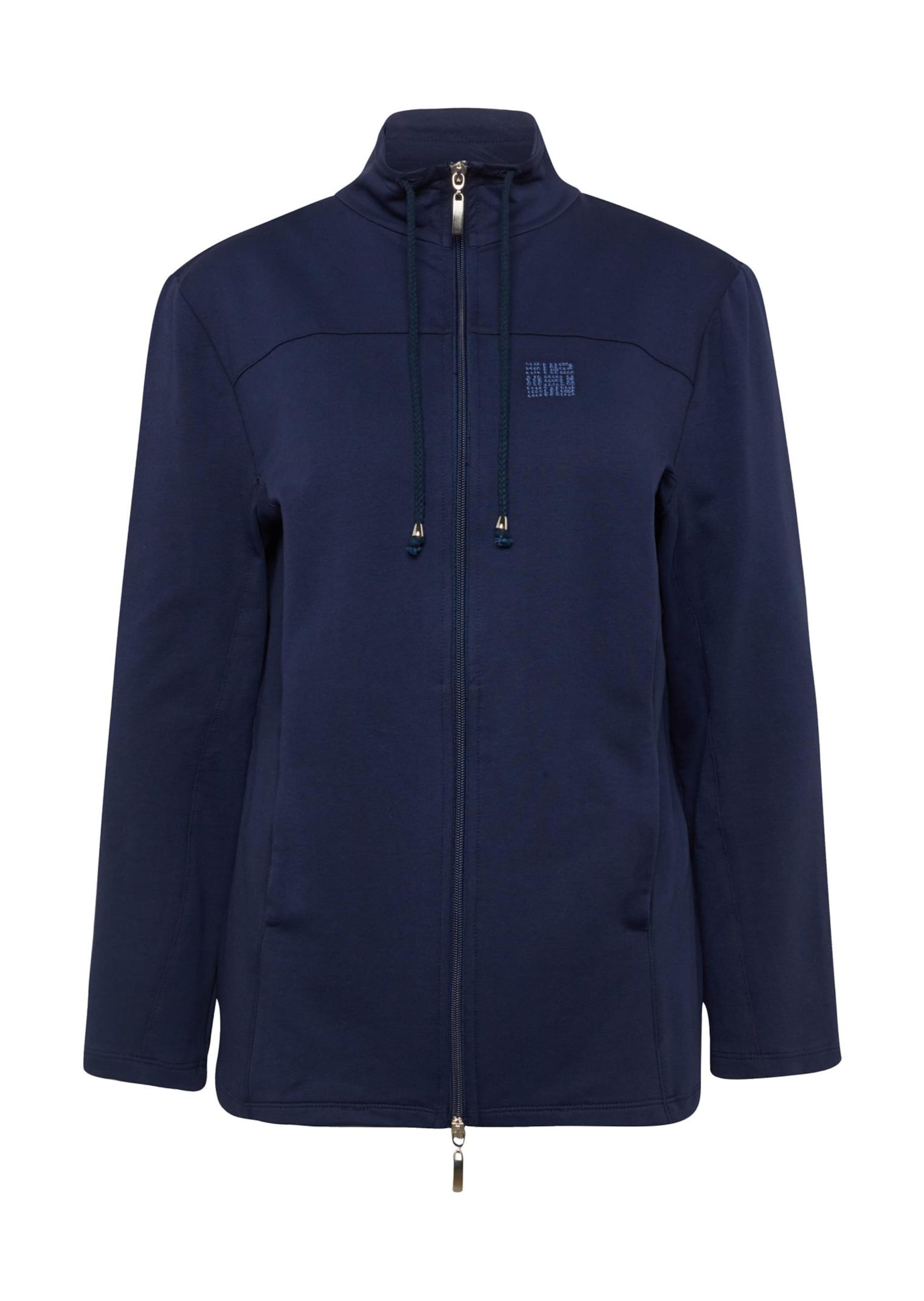 Sweatjacke mit durchgehendem Reißverschluss und hoch zu schließendem Stehkragen mit Kordelzug. Figurschmeichelnde Teilungsnähte sorgen für eine streckende Optik. Schönes Detail ist die dezente Ton-in-Ton-Stickerei. Zwei seitliche Eingrifftaschen in der Seitennaht. Länge 66 cm in Gr. 46, ca. 62 cm in Gr. 23.