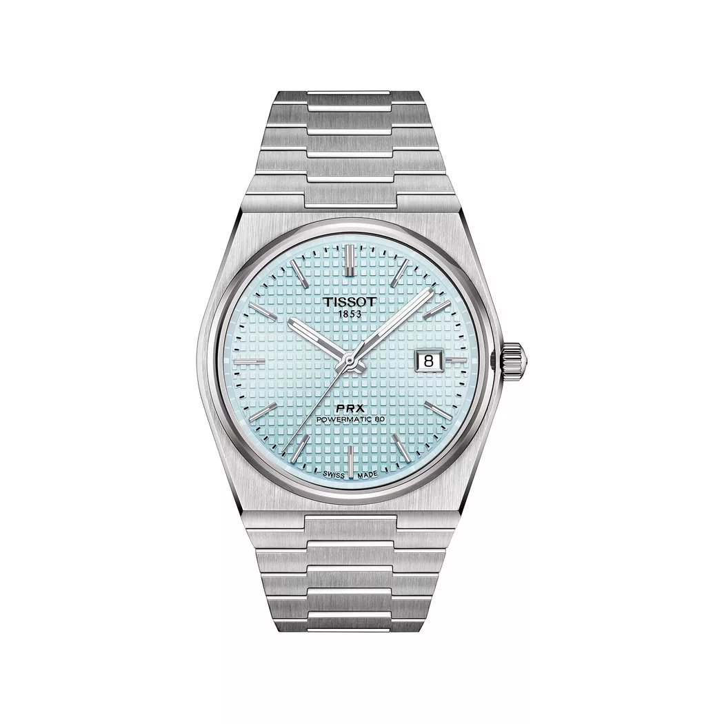 Die Tissot PRX Powermatic 80 ist mit einem Zifferblatt mit Wabenmotiv in Verbindung mit vernickelten Indexen und Zeigern ausgestattet. Die Linien des Gehäuses verlängern sich direkt und ohne Einsatz der traditionellen Hörner in das Armband. Dessen auffälligstes Merkmal ist seine Reihe grosser Glieder, die die gesamte Breite beanspruchen. Seine Flexibilität und Geschmeidigkeit machen es zu einem echten Erfolg ergonomischen Designs und vermitteln ein ausserordentliches Tragegefühl. Das Satinieren an den Aussenseiten ist ebenso sorgfältig ausgeführt wie das Polieren der Innenflächen.Das 316L-Edelstahlgehäuse der Tissot PRX hat einen Durchmesser von 40 mm. Es weist eine leichte Tonneau-Form auf und wird von einer schmalen, runden Lünette geziert. An den Seiten wechseln sich vertikal gebürstete, abgerundete Finishes mit polierten Facetten ab.Die Zeiger der Tissot PRX Powermatic 80 sind mit einer SuperLumiNova®-Beschichtung versehen und wurden mit nur sehr geringem Abstand übereinandergesetzt. Dies erlaubt es, das Zifferblatt näher an das Uhrenglas zu bringen. Der von den Tissot-Designern so erzielte optische Effekt lässt das Gehäuse der Uhr noch flacher und schlanker erscheinen, als es tatsächlich ist.Die Uhr verfügt über ein kratzfestes, entspiegeltes Saphirglas sowie über einen Sichtboden aus Mineralglas. Ihr Swiss Made Automatikwerk mit bis zu 80 Stunden Gangreserve ist mit einer Nivachron-Spiralfeder versehen, welche für eine herausragende Magnetfeldsicherheit bekannt ist.Diese Ausführung der Tissot PRX Powermatic 80 besitzt ein hellblaues Zifferblatt mit Indizes und ein 316L-Edelstahlarmband mit Schnellwechselsystem und Butterfly-Faltschliesse mit Drückern. - Modellname: PRX - Marketingfarbe: Silber - Produktgröße: 40mm - Marke: Tissot