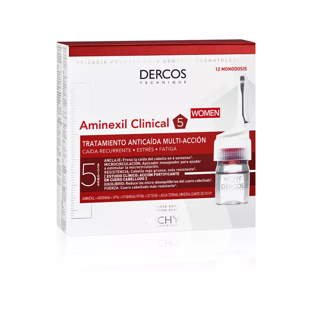 Vichy Dercos Aminexil Clinical 5 Anti-Haarausfall-Kur 21x6ml für Frauen besitzt eine 5-Fach Wirkung gegen die spezifischen Hauptursachen (Schwangerschaft, Menopause, Stress oder saisonal) des Haarausfalls von Frauen. Neue verbesserte Formel:1. Verstärkt die Verankerung der Haarwurzel in der Kopfhaut (Aminexil)2. Verbessert die Mikrozirkulation (Arginin)3. Verstärkt die Haarfaser und macht sie resistenter (SP93)4. Reduziert das Mikro-Ungleichgewicht der Kopfhaut (Octeine)5. Stärkt und beruhigt die Kopfhaut gegenüber äusseren Einflüssen (Thermalwasser) - Modellname: DERCOS AMINEXIL CLINICAL 5 WOMEN - Produktgröße: 126ml - Marke: VICHY